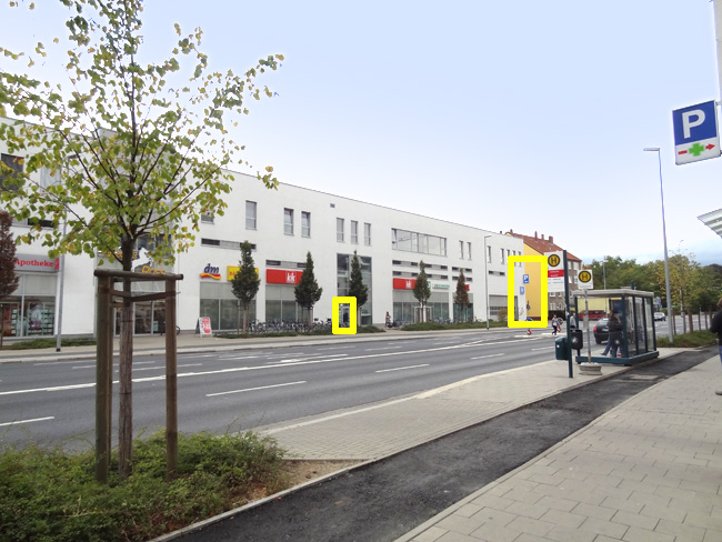 Celler Straße Eingang Nr. 30 (links), Auffahrt zum Parkdeck (rechts)